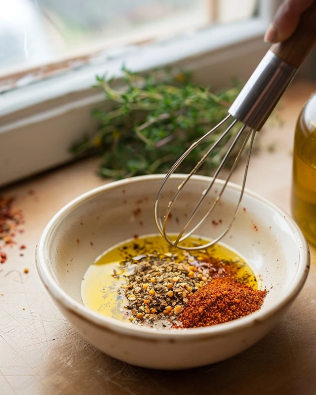 In a mixing bowl, combine the olive oil, garlic powder, onion powder, paprika, salt, and pepper. Stir until well blended. Each seasoning plays a role: garlic and onion powder add depth, while paprika gives a beautiful color and a hint of smokiness. This mixture is what makes your chicken thighs burst with flavor!