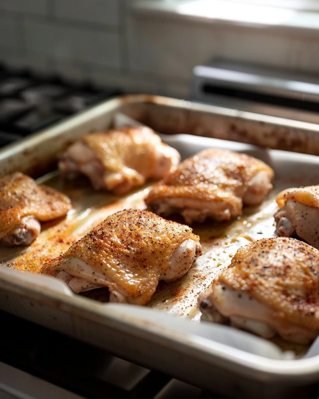 Next, line a baking sheet with parchment paper for easy cleanup. Place the seasoned chicken thighs on the sheet, leaving some space between each piece. This allows the heat to circulate, ensuring even cooking. Crowding the pan can lead to steaming instead of baking, which we want to avoid!
