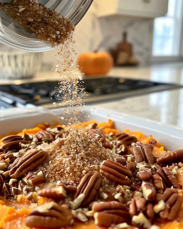 - In a separate bowl, mix the chopped pecans with brown sugar and sprinkle over the sweet potato mixture.